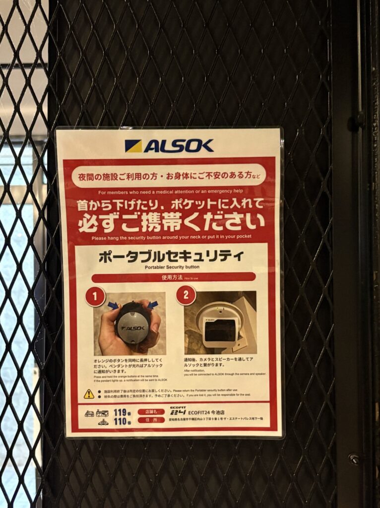 24時間ジムはスタッフいないというのが、不安に感じますが、エコフィット24名古屋今池店はALSOKのサービスでポータブルセキュリティがあり、夜間施設利用、身体に不安がある人には心強いサービスですよね。